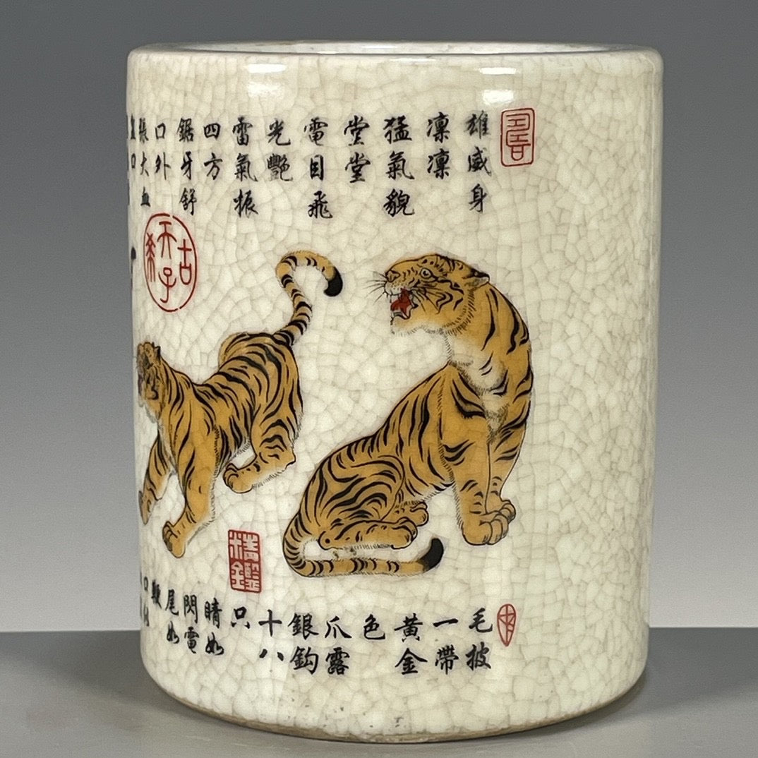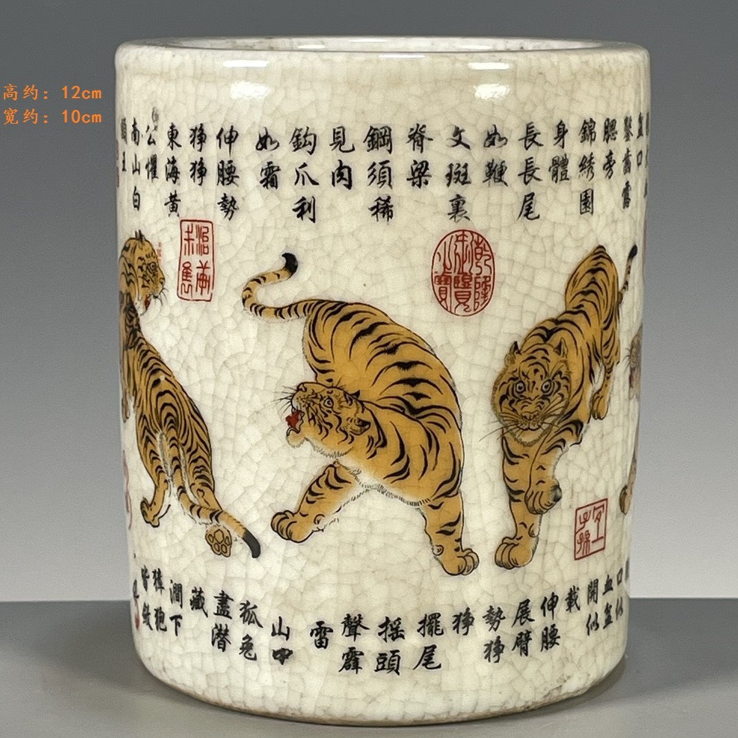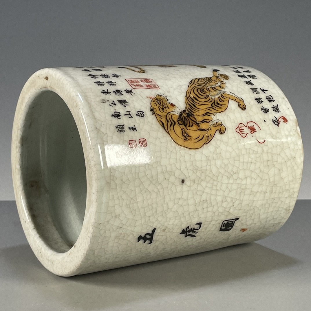 This antique porcelain pen holder, adorned with five powerful tiger motifs, is a unique Feng Shui item believed to ward off evil spirits and protect against negative energy.